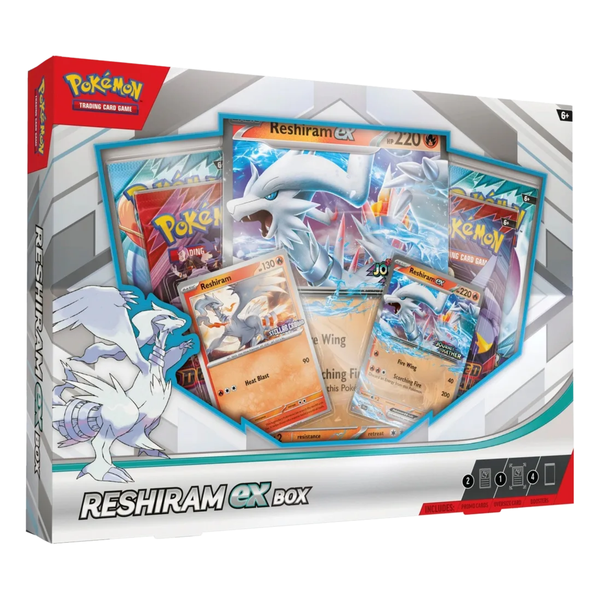 Add legendary power to your collection with Reshiram ex. This box includes exclusive foil promo cards, a jumbo display card, and multiple booster packs from the Scarlet & Violet era—perfect for both play and collecting.