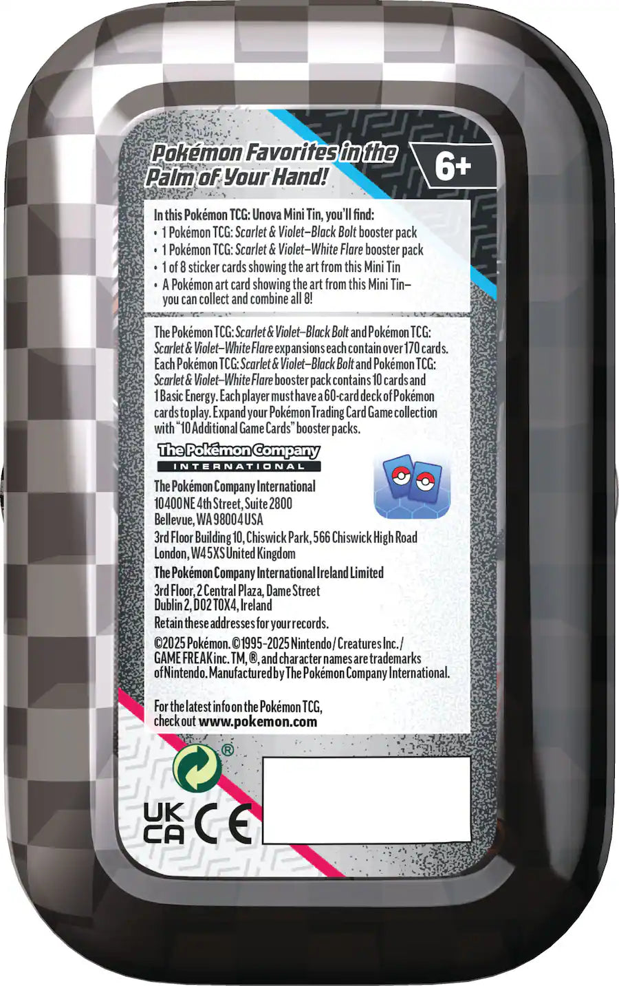 The Unova Mini Tin is a compact collectible featuring Pokémon from the Unova region. Each tin includes two booster packs from the Scarlet & Violet era, plus exclusive collectibles. Collect all 8 unique tin designs to complete a larger connected artwork.
